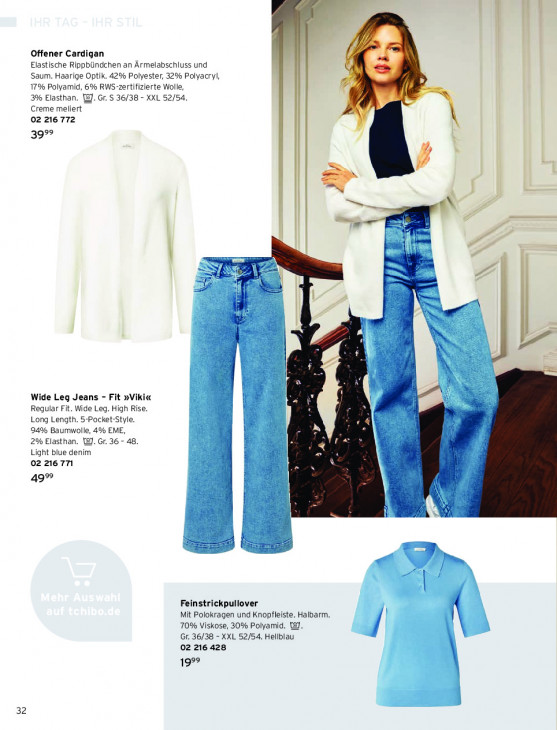 Bitte beachten Sie, dass dieser Text automatisch generiert wird und möglicherweise Fehler enthältOffener Cardigan Elastische Rippbündchen an Ärmelabschluss und Saum. Haarige Optik. 42% Polyester, 32% Polyacryl, 17% Polyamid, 6% RWS-zertifizierte Wolle, 3% Elasthan. WI. Gr. S 36/38 - XXL 52/54. Creme meliert 02 216 772 99 N Eu 5 u S Co ZEN SI == NS = a Fe Fi ei si de F A Bi u ce = ji en à à haat 3 à £ Fe = 3 f er ES an ® 4 N a dE u à £ à 2 Wide Leg Jeans - Fit »Viki« Regular Fit. Wide Leg. High Rise. Long Length. 5-Pocket-Style. ii KS fi: 94% Baumwolle, 4% EME, = 3 Ei a il À 2% Elasthan. @. Gr. 36 - 48. | Light blue denim Pr 02 216 771 re 5 49° I 2 : # # 3 F1 IR x Be a 5 zn Er, El Ê Se D = 2 en = /\ Feinstrickpullover Mit Polokragen und Knopfleiste. Halbarm. 70% Viskose, 30% Polyamid. {&. Gr. 36/38 - XXL 52/54. Hellblau / 02 216 428 999 32