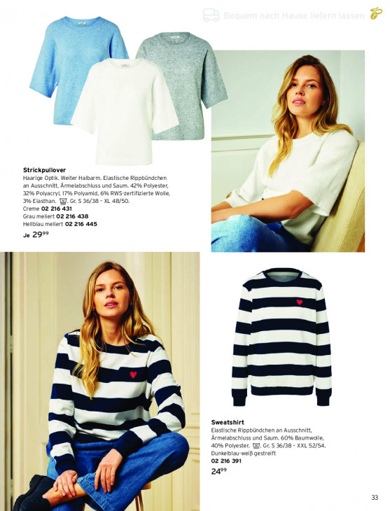 Bitte beachten Sie, dass dieser Text automatisch generiert wird und möglicherweise Fehler enthält= > Le = & EA GN d à = 4 ER = Á U y £ = fe m À Strickpullover Haarige Optik. Weiter Halbarm. Elastische Rippbündchen an Ausschnitt, Ärmelabschluss und Saum. 42% Polyester, 32% Polyacryl, 17% Polyamid, 6% RWS-zertifizierte Wolle, 3% Elasthan. WJ. Gr. S 36/38 - XL 48/50. Creme 02 216 431 Grau meliert 02 216 438 Hellblau meliert 02 216 445 Je 29°? 4 | N — — ze Sweatshirt Elastische Rippbündchen an Ausschnitt, 2 ‚Ärmelabschluss und Saum. 60% Baumwolle, 40% Polyester. @. Gr. S 36/38 - XXL 52/54. Dunkelblau-weiß gestreift 02 216 391 [1 24° mmm 33 | L