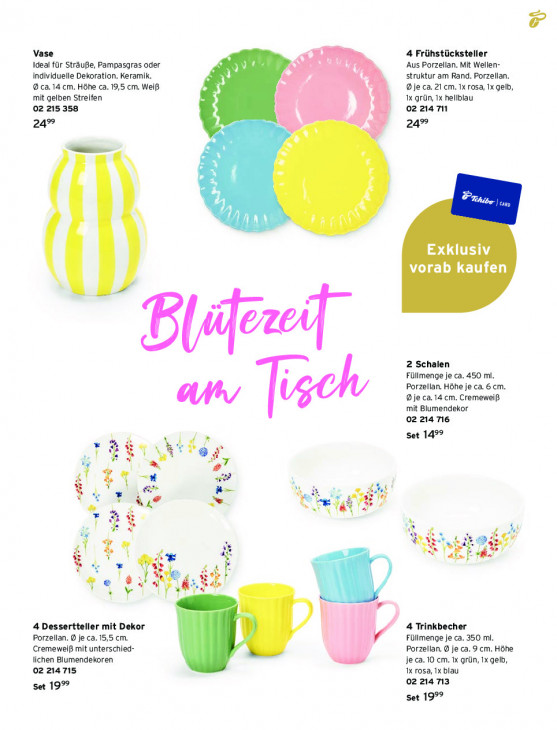 Bitte beachten Sie, dass dieser Text automatisch generiert wird und möglicherweise Fehler enthältVase 4 KN 4 Frühstücksteller Ideal für Sträuße, Pampasgras oder 7 Aus Porzellan. Mit Wellen- individuelle Dekoration. Keramik. je struktur am Rand. Porzellan. 9 ca. 14 cm. Höhe ca. 19,5 cm. Weiß 0 je ca. 21 cm. Ix rosa, 1x gelb, mit gelben Streifen 1x grün, 1x hellblau 02 215 358 | | ) 0221471 24° 24° : . } u N à LL B ci Exklusiv vorab kaufen Bidet 2 Schalen Füllmenge je ca. 450 m. Porzellan. Höhe je ca 6cm. 0 je ca. 14 cm. CremeweiB mit Blumendekor un, Tech 02 214 716 Set 149° 4 ï $ $ A ter il 31 = N ar e ë av, 4 +. ar x : = ; > KE 5 2 } ke B 4, N Wirt 8 40 ar 4 & 1% Fa fr F4 EA $ } T 7 + 4 4 Ÿ 4 Dessertteller mit Dekor 4 Trinkbecher Porzellan. 9 je ca. 15,5 cm. Füllmenge je ca. 350 mi. Cremeweiß mit unterschied- Porzellan. ® je ca.9 cm. Höhe lichen Blumendekoren je ca. 10 cm. 1x grün, 1x gelb, 02214715 1x rosa, 1x blau Set 19% 02 214 713 Set 19°°