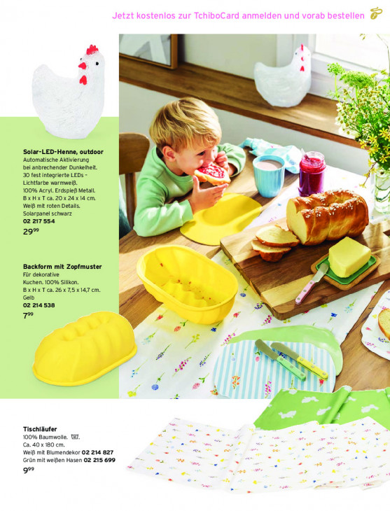 Bitte beachten Sie, dass dieser Text automatisch generiert wird und möglicherweise Fehler enthältJetzt kostenlos zur TchiboCard anmelden und vorab bestellen > à Fe Hr Dee & IR ER ier à D =, Solar-LED-Henne, outdoor pe ‚Automatische Aktivierung bei anbrechender Dunkelheit. à . 30 fest integrierte LEDs - | Lichtfarbe warmweiß. 71h 100% Acryl. Erdspieß Metall. > N BxHXT ca. 20 x 24x14 cm. L7 Weiß mit roten Details. ef Solarpanel schwarz 02 217554 70 292 Backform mit Zopfmuster Für dekorative Kuchen. 100% Silikon. BXHXT ca.26x7,5x147 cm. Gelb 7e 02 214538 7» Sg 2 \ # = Ar m” de æ À Fa | Lan st EN Eu ; Tischläufer 100% Baumwolle. Tal. Ca.40x180 cm. Weiß mit Blumendekor 02 214 827 Grün mit weißen Hasen 02 215 699 =. Ds 999