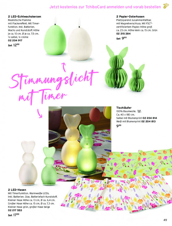 Bitte beachten Sie, dass dieser Text automatisch generiert wird und möglicherweise Fehler enthältJetzt kostenlos zur TchiboCard anmelden und vorab bestellen 7 2 LED-Echtwachskerzen 2 Papier-Osterhasen Realistische Flamme Platzsparend zusammenfaltbar, mit Flackereffekt. Mit Timer- mit Magnetverschluss. Mit FSC®- funktion. Inkl. Batterien. zertifiziertem Papier. Höhe groß Wachs und Kunststoff. Höhe ca. 23 cm. Höhe klein ca. 15 cm. Grün je ca. 10 cm. 9 je ca. 7,5 cm. 02 215 284 1x salbel, Ix creme Set 999 02204 917 Set 12° zwang sticht Tr Tischläufer 100% Baumwolle. WJ. Ca. 40 x180 cm. Salbei mit Blumenprint 02 204 814 Weiß mit Blumenprint 02 204 813 9® ‘ À À Be 5 * en & % pl = Fa & de re on RE ÈS es, helf LR 2 LED-Hasen dt 0) D N Mit Timerfunktion. Warmweiße LEDs. 8 4 N Inkl. Batterien. Glas. Batteriefach Kunststoff. à Kleiner Hase Höhe ca. 13 cm, D ca. 6,4 cm. f Pit #1 { NS Grofer Hase Höhe ca. 15 cm, D ca. 7,3 cm. Re) à a N Kleiner Hase grün, großer Hase beige eef 02 217 553 eze à x No Set 17% 49