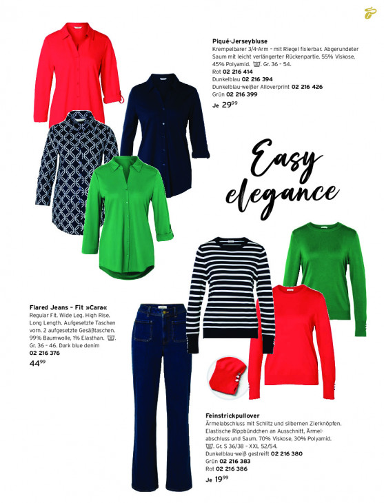 Bitte beachten Sie, dass dieser Text automatisch generiert wird und möglicherweise Fehler enthältPiqué-Jerseybluse Krempelbarer 3/4-Arm - mit Riegel fixierbar. Abgerundeter Saum mit leicht verlängerter Rückenpartie. 55% Viskose, 45% Polyamid. WI. Gr. 36 - 54. Rot 02 216 414 Dunkelblau O2 216 394 Dunkelblau-weißer Alloverprint 02 216 426 Grün 02 216 399 Je 299° ik LS > IE 10 Nl & h ie TOI on \ Se 4 Di A JAN à a 4 ” EN 2 Va IN 4 N > d JS iQ N À AE A A ’ N “ iN 2 N iQ N 5, 4 ns À N x NY Qi ad VvN = N & 1 N X N A 6) À 4 € 2 6 2 À sen zus m Flared Jeans - Fit »Cara« en Regular Fit. Wide Leg. High Rise. Long Length. Aufgesetzte Taschen 1 vorn. 2 aufgesetzte Gesäßtaschen. 99% Baumwolle, 1% Elasthan. 19. Gr. 36 - 46. Dark blue denim 02 216 376 E 44% al Feinstrickpullover Ärmelabschluss mit Schlitz und silbernen Zierknöpfen. Elastische Rippbündchen an Ausschnitt, Ärmel- abschluss und Saum. 70% Viskose, 30% Polyamid. W. Gr. S 36/38 - XXL 52/54. Dunkelblau-weiß gestreift 02 216 380 Grün 02 216 383 Rot 02 216 386 Je 19%