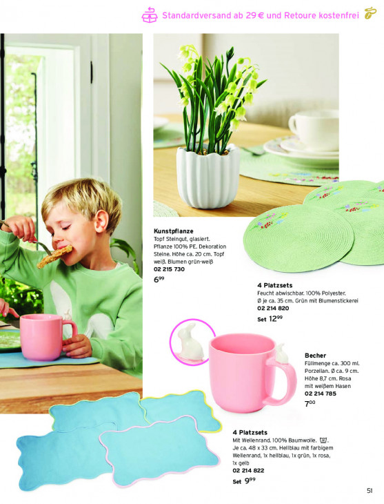 Bitte beachten Sie, dass dieser Text automatisch generiert wird und möglicherweise Fehler enthält& Standardversand ab 29€ und Retoure kostenfrei _ 1/7 | LR «t Ps 22 it x 7 en = PE m *] Kunstpflanze N Topf Steingut, glasiert. I Pflanze 100% PE. Dekoration I I ) 2 | Steine, Höhe ca. 20 cm. Topf weiß. Blumen grün-weiß 02 215 730 6” 4 Platzsets Feucht abwischbar. 100% Polyester. 9 je ca. 35 cm. Grün mit Blumenstickerei 02 214 820 Set 12% Becher Füllmenge ca. 300 ml. Porzellan. D ca. 9 cm. Hôhe 87 cm. Rosa mit weißem Hasen 02214785 70° | (D 4 Platzsets Mit Wellenrand. 100% Baumwolle. 139. Je ca. 48 x33 cm. Hellblau mit farbigem Wellenrand, 1x hellblau, Ix grün, Ix rosa, 1x gelb 02 214 822 Set 999 51