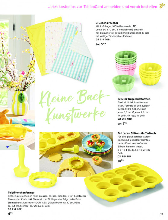 Bitte beachten Sie, dass dieser Text automatisch generiert wird und möglicherweise Fehler enthältJetzt kostenlos zur TchiboCard anmelden und vorab bestellen F 3 Geschirrtücher Mit Aufhänger. 100% Baumwolle. Wal. RR N Je ca. 50 x70 cm. Ix hellblau-weiß gestreift mit Blumenprint, Ik weiß mit Blumenprint, 1x gelb D : ES Er! # mit welliger Stickerei als Rahmen \ 02 214 708 vk Set 999 / ar Ir (a / 11 7 \ & ÿ ES sE | 2 IH À, Cr {N EN Le: a a N. er Pp 2 D, LAM 12 Mini-Gugelhupfformen nn Bach Flexibel für leichtes Heraus- „s !ösen. Formstabil und auslauf- sicher. 100% Silikon. Höhe L L? P/ je ca. 3,5 cm. 9 je ca. 7,5 cm. l 4x grün, Ax rosa, 4x gelb | ANG Le 02 214 480 set 7° D: Faltbares Silikon-Muffinblech Für eine platzsparende Aufbe- be wahrung. Flexibel für leichtes 7.508 Herauslösen. Auslaufsicher. ‚m Silikon. Rahmen Metall. ER x BxHxT ca. 38,5 x 4x 27 cm. Gelb 02 215 915 14% Teigförmchenformer Einfach ausstechen, in Form pressen, backen, befüllen. 2-in-l-Ausstecher — Blume oder Kreis. Inkl. Stempel zum Einfügen des Teigs in die Form. Stempel und Ausstecher 100% ABS. ® Ausstecher ca. 10 cm. Höhe ca. 2,4 cm. Stempel ca. 12 x 6 cm. Gelb 02214 652 4®