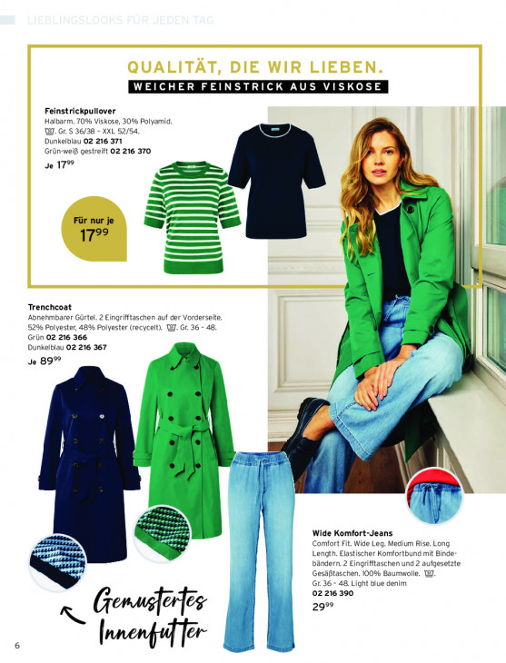 Bitte beachten Sie, dass dieser Text automatisch generiert wird und möglicherweise Fehler enthältWEICHER FEINSTRICK AUS VISKOSE Feinstrickpullover Halbarm. 70% Viskose, 30% Polyamid. WI. Gr. 5 36/38 - XXL 52/54. Dunkelblau 02 216 371 Grün-weiß gestreift 02 216 370 Je 17° & = Er. = Ce Für nur je 5 fn in) 17°° NS Zn { W ver 5 - Trenchcoat Abnehmbarer Gürtel. 2 Eingrifftaschen auf der Vorderseite. 52% Polyester, 48% Polyester (recycelt). WJ. Gr. 36 - 48. Grün 02 216 366 Dunkelblau 02 216 367 Je 89° S il pe le rer V . Aum ns en. 4 En AR EB > 2 Seas N Wide Komfort-Jeans x geen Comfort Fit. Wide Leg. Medium Rise. Long Length. Elastischer Komfortbund mit Binde- bändern. 2 Eingrifftaschen und 2 aufgesetzte Gesäßtaschen. 100% Baumwolle. I]. Gr 36 - 48. Light blue denim 02 216 390 Genus 999 ! bengel