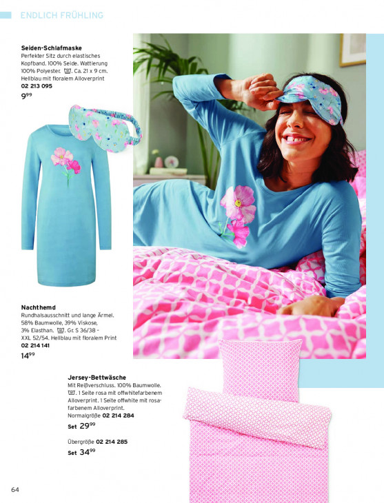 Bitte beachten Sie, dass dieser Text automatisch generiert wird und möglicherweise Fehler enthält4 Seiden-Schlafmaske Perfekter Sitz durch elastisches Kopfband. 100% Seide. Wattierung 100% Polyester. WJ. Ca. 21 x 9 cm. Hellblau mit floralem Alloverprint 02 213 095 99 à N : =. ra " We N U ré + 4 | „} Ui TT: 5 | { | Le x ) Ne (oi ee Ir Pe Bi} à Ds + À ‘> Nachthemd ‚3 Rundhalsausschnitt und lange Ärmel 1 58% Baumwolle, 39% Viskose, mere zo 3% Elasthan. W. Gr. S 36/38 - XXL 52/54. Hellblau mit floralem Print “a 02 214141 499 md Jersey-Bettwäsche Mit Reißverschluss. 100% Baumwolle. 187.1 Seite rosa mit offwhitefarbenem Alloverprint. 1 Seite offwhite mit rosa- farbenem Alloverprint. Normalgröße 02 214 284 Set 29% SES x RS: ass Übergröße 02 214 285 Re Set 34% 64