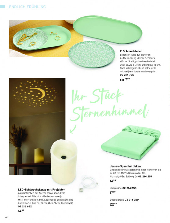 Bitte beachten Sie, dass dieser Text automatisch generiert wird und möglicherweise Fehler enthält5 2 À À ae 5 CH, 8 EE > À + & = B: 2 Schmuckteller N RS Erhöhter Rand zur sicheren ‚Aufbewahrung kleiner Schmuck- a stücke. Stahl, pulverbeschichtet. Oval ca. 22 x 13 cm. rund ca. 13cm. Oval salbeigrün. Rund salbeigrün mit weißem floralem Alloverprint 02 214 706 Set 7°° AU wer Ze = I = Jersey-Spannbettlaken Geeignet für Matratzen mit einer Höhe von bis zu 20 cm. 100% Baumwolle. 127. Normalgröße. Salbeigrün 02 214 257 499 Übergröße 02 214 258 LED-Echtwachskerze mit Projektor Akkubetrieben mit Sternenprojektion. Fest 17% integrierte LEDs - Lichtfarbe warmweiß. Mit Timerfunktion. Inkl. Ladekabel. Echtwachs und Doppelgröpe 02 214 259 Kunststoff. Höhe ca. 15 cm. @ ca. 9 cm. Cremeweiß 299 02 216 632 14% 76