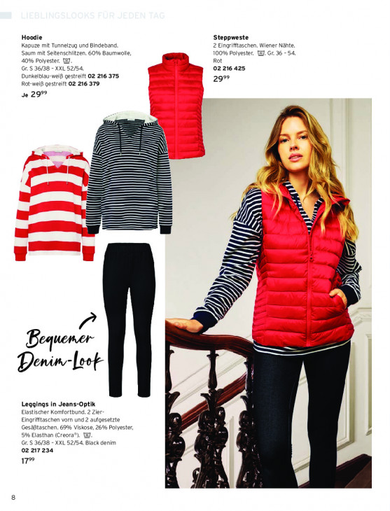 Bitte beachten Sie, dass dieser Text automatisch generiert wird und möglicherweise Fehler enthältHoodie Steppweste Kapuze mit Tunnelzug und Bindeband. 2 Eingrifftaschen. Wiener Nähte. u Saum mit Seitenschlitzen. 60% Baumwolle, 100% Polyester. 1. Gr. 36 - 54, 40% Polyester. ad, Rot 7 Gr. S 36/38 - XXL 52/54. 02 216 425 Dunkelblau-weiß gestreift 02 216 375 999 Rot-weiß gestreift 02 216 379 Je 299° RI a = > =} ER Z TE E ZEN = N N Ze = CA SS Se | = ee k — —— > NS en a —— ——— IK m I r % Ze 5 4 } _ > —— EA Bequener Se en” leef 4 Leggings in Jeans-Optik Elastischer Komfortbund. 2 Zier- A GR Eingrifftaschen vorn und 2 aufgesetzte mn Gesäßtaschen. 69% Viskose, 26% Polyester, 5 f 2 5% Elasthan (Creora®). @. N Gr. S 36/38 - XXL 52/54. Black denim pn 02 217 234 I 172 DN