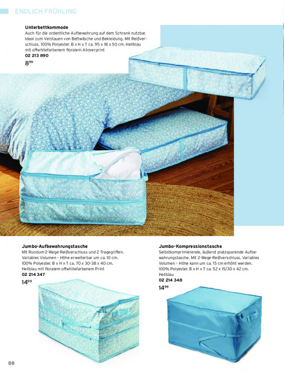 Bitte beachten Sie, dass dieser Text automatisch generiert wird und möglicherweise Fehler enthältUnterbettkommode Auch für die ordentliche Aufbewahrung auf dem Schrank nutzbar. Ideal zum Verstauen von Bettwäsche und Bekleidung. Mit Reißver- schluss. 100% Polyester. BxH x T ca. 95 x 18 x 50 cm. Hellblau mit offwhitefarbenem floralem Alloverprint 02 213 890 8” mn — > Biens: | a | ! SR ES € Rn # x BL Y de à % 85 A + & se & { | ÈS j A ú bel a2 5 hr a fi ka À ® Dhs Jumbo-Aufbewahrungstasche Jumbo-Kompressionstasche Selbstkomprimierende, äußerst platzsparende Aufbe- Mit Rundum2-Wege-Reißverschluss und 2 Tragegriffen. Variables Volumen - Höhe erweiterbar um ca. 10 cm. wahrungstasche. Mit 2-Wege-Reißverschluss. Variables 100% Polyester. B x H x T ca. 70 x 30-38 x 40 cm. Volumen - Höhe kann um ca. 15 cm erhöht werden. Hellblau mit floralem offwhitefarbenem Print 100% Polyester. B xH x T ca. 52 x 15/30 x 42 cm. 02 214 347 Hellblau 1499 02 214 348 14® Re... 6 AL „it etn ‚| # | A =. Za Br 88