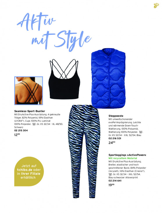 Bitte beachten Sie, dass dieser Text automatisch generiert wird und möglicherweise Fehler enthält[ir ij ij = = SQ IN Seamless-Sport-Bustier Mit DryActive Plus-Ausrüstung. 4 gekreuzte NX II III Steppweste Träger. 82% Polyamid, 18% Elasthan Mit umweltschonender (LYCRA®). Cups 100% PU. Laminat 100% Polyester. @. Gr. XS 32/34 - XL 48/50. evoPel-Imprägnierung. Leichte I und wärmende Down-Touch- Schwarz SS 02 215 304 = II Wattierung. 100% Polyamid, Wattierung 100% Polyester. WJ. 12% Gr. XS 32/34 - XXL 52/54. Blau IS 02 216 531 N 499 SSS Sportlegaings »ActivePowerc SS Mit recyceltem Material N NS Mit DryActive Plus-Ausrüstung. Jetzt auf Breiter, elastischer und hoch geschnittener Bund. 84% Polyester tchibo.de oder N (recycelt), 16% Elasthan (Creora®). in Ihrer Filiale W. Gr. XS 32/34 - XXL 52/54. N erhältlich S = Blau-schwarzer Alloverprint 02 214 641 199 SZ x S N